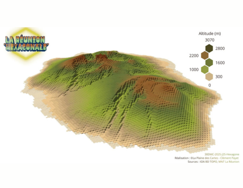 Le relief réunionnais occupe une place centrale dans son travail. Les cartes de la Plaine des Sables, les représentations tridimensionnelles du relief ou encore les jeux de cartes dédiés aux risques naturels montrent une maîtrise avancée des données topographiques.