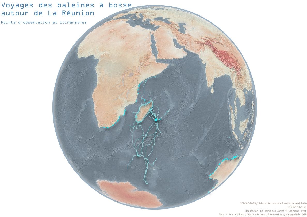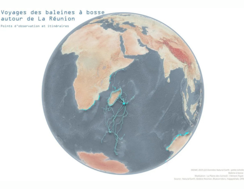 Avec la carte des voyages des baleines à bosse autour de La Réunion, Clément Payet replace l’île dans des dynamiques océaniques globales. La cartographie devient alors un outil de mise en perspective, montrant que La Réunion est un point d’ancrage dans des flux naturels mondiaux.