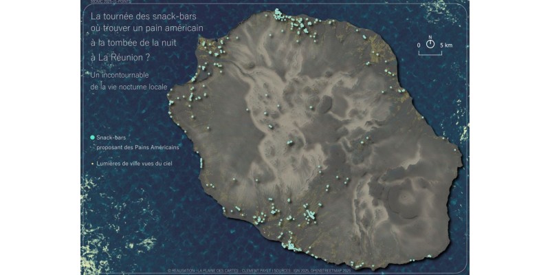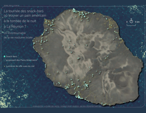 À l’opposé apparent, mais dans une logique cohérente, Clément Payet cartographie également des usages populaires et ancrés dans le quotidien, comme la carte des snack-bars proposant des pains américains la nuit à La Réunion. Derrière une thématique accessible se dessine une lecture fine des centralités nocturnes, des mobilités et des modes de vie locaux.