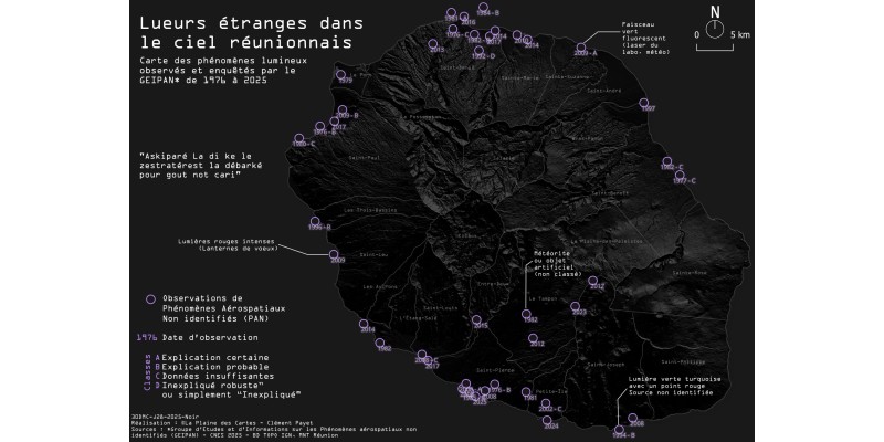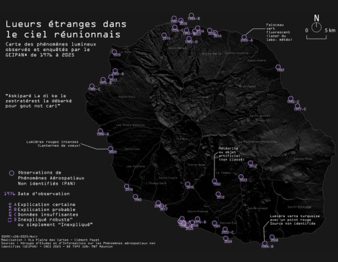 Certaines productions explorent des champs plus inattendus, comme la cartographie des phénomènes lumineux observés dans le ciel réunionnais à partir des données du GEIPAN. Sources citées, classifications claires et précautions méthodologiques permettent ici de représenter l’incertitude sans la déformer.