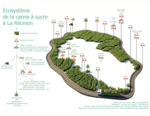 Parmi ses cartes les plus emblématiques figure celle consacrée à l’écosystème de la canne à sucre à La Réunion. Cette cartographie dépasse largement la simple localisation des champs ou des usines. Elle représente l’ensemble du système, depuis la production agricole jusqu’à la transformation industrielle, en intégrant les enjeux énergétiques liés à la bagasse, les distilleries, la logistique, le patrimoine, le tourisme, les institutions et la recherche.